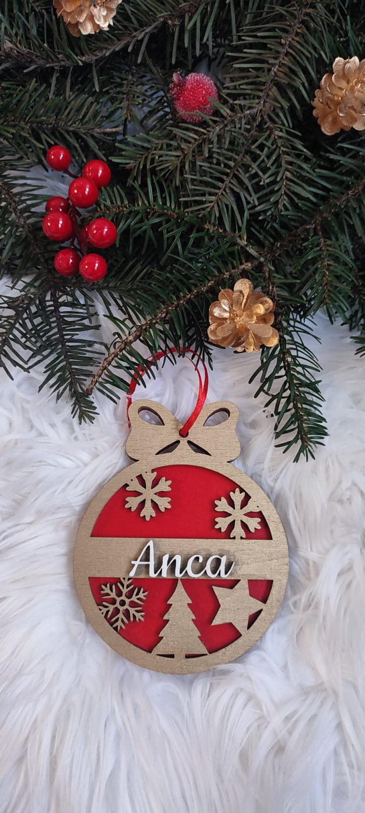 Design Stratificat : Globul este realizat prin suprapunerea a două straturi : o ramă exterioară din lemn finisat în auriu metalizat și un fundal de un roșu intens, oferind o profunzime vizuală deosebită.