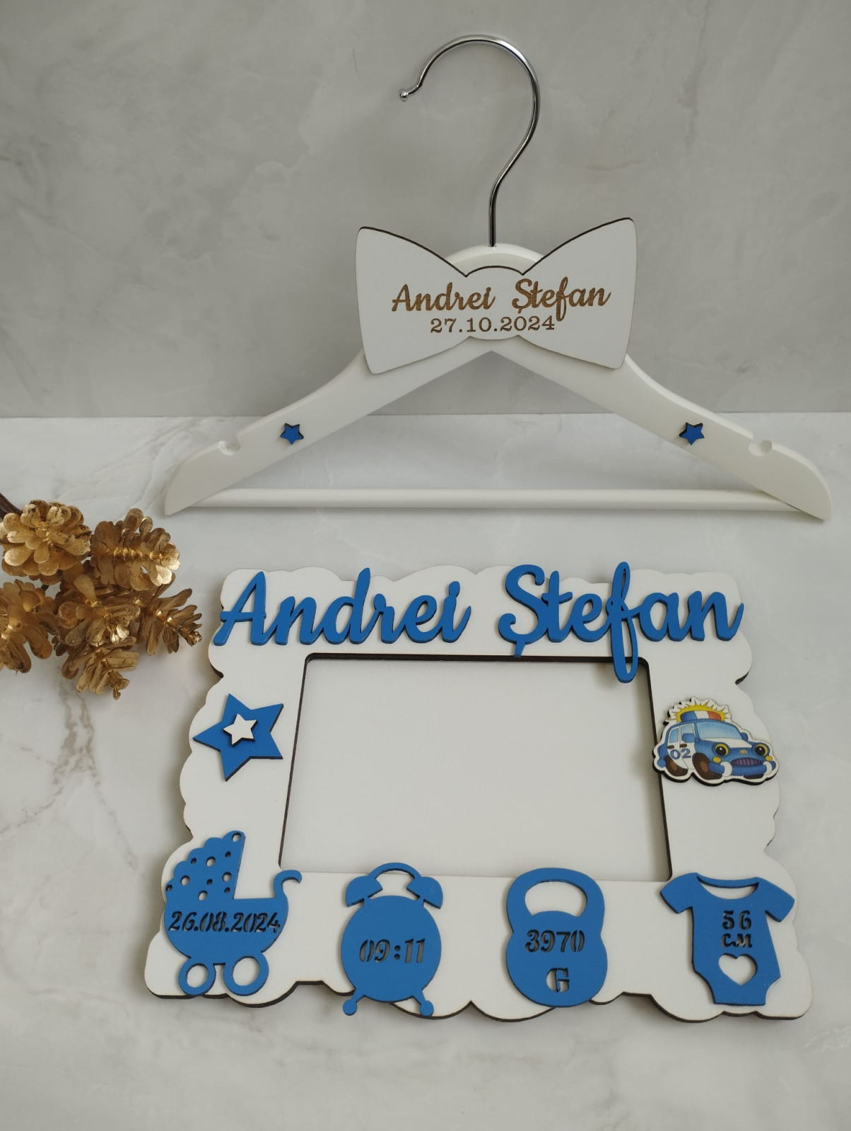 Rama este decorată cu simboluri jucăușe, fiecare purtând o informație unică despre primele momente ale micuțului/micuței tale